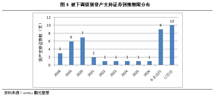 從被下調的資產支持證券到期期限來看,有9支資產支持證券已確認本金違約,10只資產支持證券已償清,剩余存續的23只資產支持證券中,其到期日主要分布于2018年至2021年間。