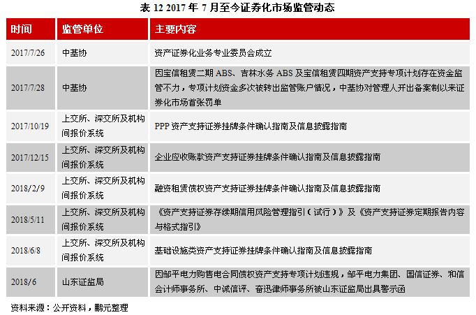 從2017年10月開始,上交所、深交所及機構間報價系統陸續發布了PPP、企業應收賬款、融資租賃債權、基礎設施類等基礎資產類別資產支持證券掛牌條件確認指南(以下簡稱“掛牌指南”)及信息披露指南,從基礎資產準入條件到信息披露兩方面強化資產證券化業務的風險防控,從源頭上控制證券化產品的風險。值得注意的是,在已發布的大類資產掛牌指南中,對基礎資產的條件及相關參與方的資質進行了明確的描述。例如,對于融資租賃類基礎資產,掛牌指南對基礎資產的分散性提出了更高的要求,對于類似于慶匯租賃ABS的單一債務人的項目已經不符合現行產品發行條件(至少包括10個相互之間不存在關聯關系的債務人,單個債務人入池資產金額占比不超過50%,且前5大債務人入池資產金額占比不超過70%。上述債務人之間存在關聯關系的,應當合并計算),對于資產分散低于0.1%的項目,要求融資租賃公司或者擔保人級別要超過AA。對于基礎設施類資產,掛牌指南要求基礎資產運營滿兩年,要求原始權益人或增信方級別在AA及以上,因此對于之前違約的大成黃河西ABS項目,其擔保方評級僅為AA-,已不符合現在的產品發行條件。對于資金監管不力、挪用基礎資產現金的現象,監管機構通過嚴管項目參與方,出示警示函和監管懲戒的方式督處各項目參與方盡職盡責。2017年7月28日,中基協針對恒泰證券管理的3只資產證券化產品存在基礎資產現金流挪用、現金流歸集及管理不規范現象,對其下達了國內備案制以來資產證券化領域首張罰單。2018年5月11日公布的《上海證券交易所資產支持證券存續期信用風險管理指引(試行)》及《深圳證券交易所資產支持證券存續期信用風險管理指引(試行)》,要求管理人在資產證券化產品存續期內持續履行管理職責,時刻關注基礎資產和各參與人的風險變動情況,并及時預警和處置風險。2018年6月,因鄒平電力購售電合同債權資產支持專項計劃違規,鄒平電力集團、國信證券、和信會計師事務所、中誠信評、奮迅律師事務所被山東證監局出具警示函。