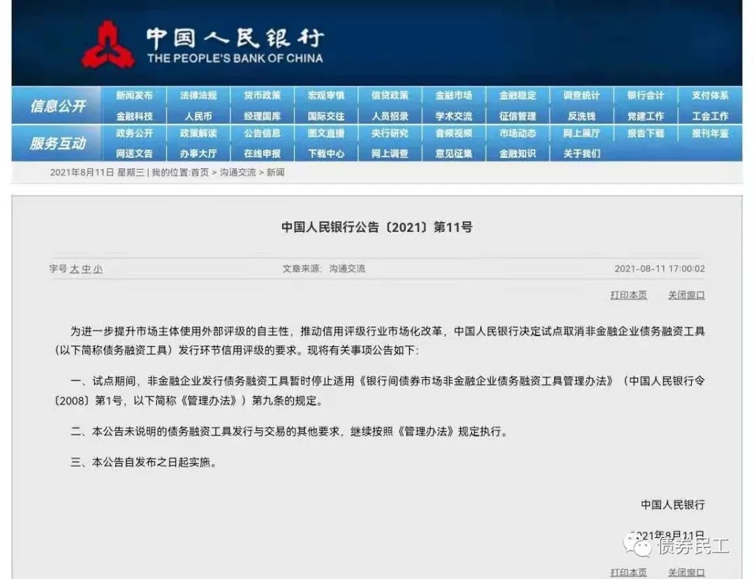 最近信用評級行業真的是監管規則不斷更新。2021年8月6日,中國人民銀行、國家發展改革委、財政部、銀保監會、證監會關于促進債券市場信用評級行業健康發展的通知。就在今天,人民銀行發文,試點取消非金融企業債務融資工具發行環節的信用評級要求。