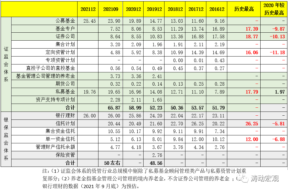1、以2021年9月底的數(shù)據(jù)為例,證監(jiān)會體系下的資產(chǎn)管理行業(yè)規(guī)模合計達(dá)到65.87萬億,銀保監(jiān)會體系下的資產(chǎn)規(guī)模亦有50萬億左右,也即兩大體系的資產(chǎn)管理行業(yè)規(guī)模合計在110萬億-120萬億之間。