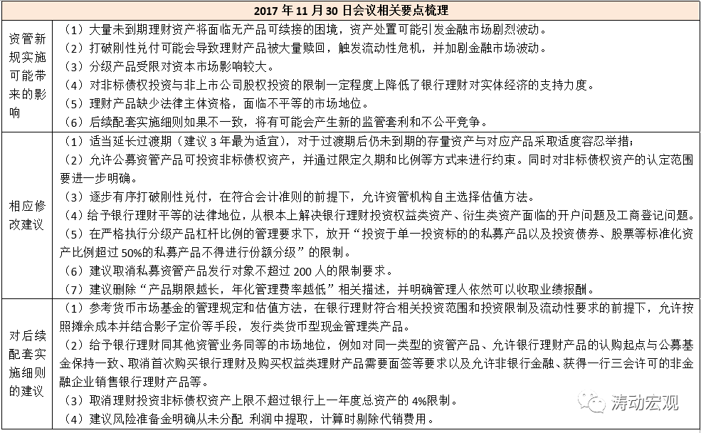 整體上看,本次專題會議的聚焦點(diǎn)主要包括(1)過渡期不夠;(2)期限錯配不應(yīng)該限制;(3)非標(biāo)資產(chǎn)有其存在的必要性;(4)凈值型產(chǎn)品轉(zhuǎn)型短期內(nèi)存在困難,造成的沖擊較大;(5)《資管新規(guī)》部分細(xì)則還沒有明確等幾個方面。