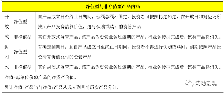 進(jìn)一步,凈值型資管產(chǎn)品亦可分為開放式和非開放式,而非凈值型資管產(chǎn)品則為過渡期產(chǎn)品。從政策導(dǎo)向上看,業(yè)務(wù)轉(zhuǎn)型完成后,非凈值型產(chǎn)品將會消失。