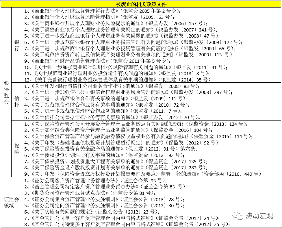 《資管新規(guī)》后,大資管行業(yè)的政策格局已被重塑,之前相關(guān)的一系列政策文件大多已退出歷史舞臺(被廢止),具體看,銀行體系有12份政策文件被廢止(包括2013年的8號文和2014年的35號文)、信托體系有6份政策文件被廢止(待信托新規(guī)正式稿出臺后進(jìn)一步明確)、保險體系有9份政策文件被廢止、證監(jiān)會體系有8份政策文件被廢止。