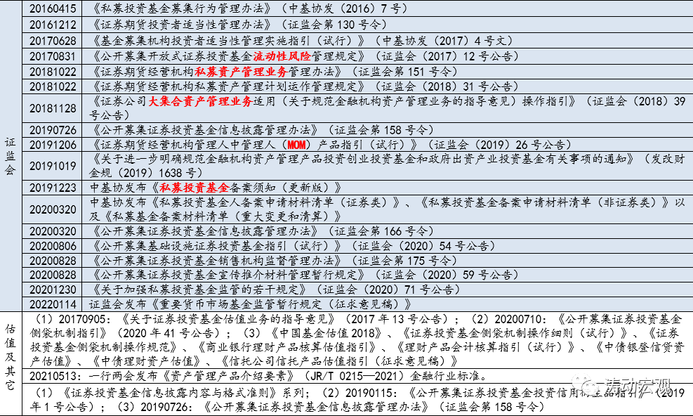 (3)證監(jiān)會的2017年12號公告、151號令、2018年31號公告和39號公告分別對公募基金(含貨幣基金)的流動性風(fēng)險(其流動性風(fēng)險管理方法同樣也被銀行理財?shù)荣Y管行業(yè)所借鑒)、私募資管以及公募資管的運(yùn)作進(jìn)行了規(guī)范。同時證監(jiān)會還發(fā)布了MOM產(chǎn)品指引、公開募集基礎(chǔ)設(shè)施證券投資基金指引。