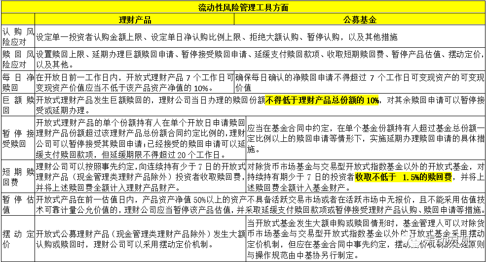 2、在贖回風(fēng)險應(yīng)對方面,工具主要包括延期辦理巨額贖回申請、暫停接受贖回申請、延緩支付贖回款項、收取短期贖回費(fèi)、暫停產(chǎn)品估值、擺動定價等。此外,理財產(chǎn)品的贖回風(fēng)險應(yīng)對方面還包括設(shè)置贖回上限。