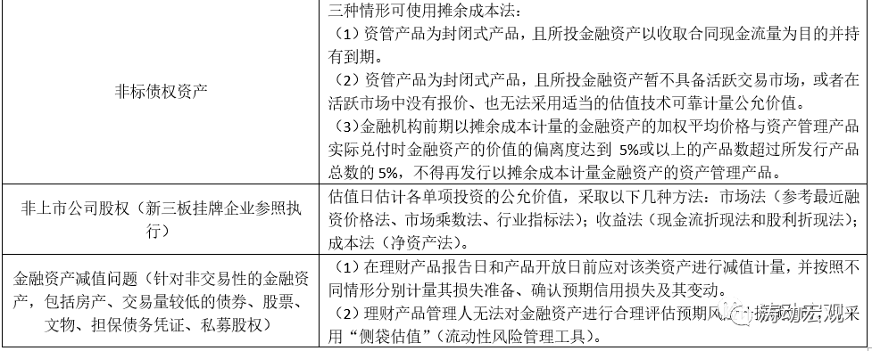 2、考慮到部分資產(chǎn)尚不具備以市值計量的條件,過渡期內(nèi)封閉期在半年以上的定期開放式資管產(chǎn)品、銀行現(xiàn)金管理類理財產(chǎn)品(當(dāng)然這里也包括貨幣市場基金)適用攤余成本計量。