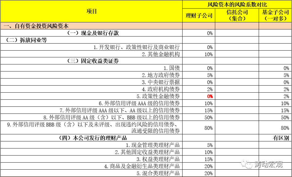 當(dāng)然,二者也有不同,如自有資金投資政策性金融債的風(fēng)險系數(shù)(理財子公司與基金子公司分別為0%和2%)、自有資金投資本公司發(fā)行的理財產(chǎn)品(理財子公司針對不同理財產(chǎn)品設(shè)定了具體的風(fēng)險系數(shù))、針對未上市企業(yè)股權(quán)的風(fēng)險系數(shù)(理財子公司與基金子公司分別為1.50%和0.60%)等等。