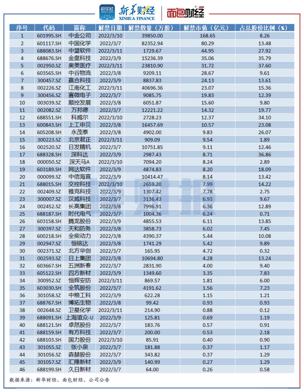 中金公司、中國化學、中望軟件為解禁市值前三名;奧美醫療、深科達及金盤科技為解禁占比前三名。其中,中國化學為定增配售股,其余均為首發原股東限售股。