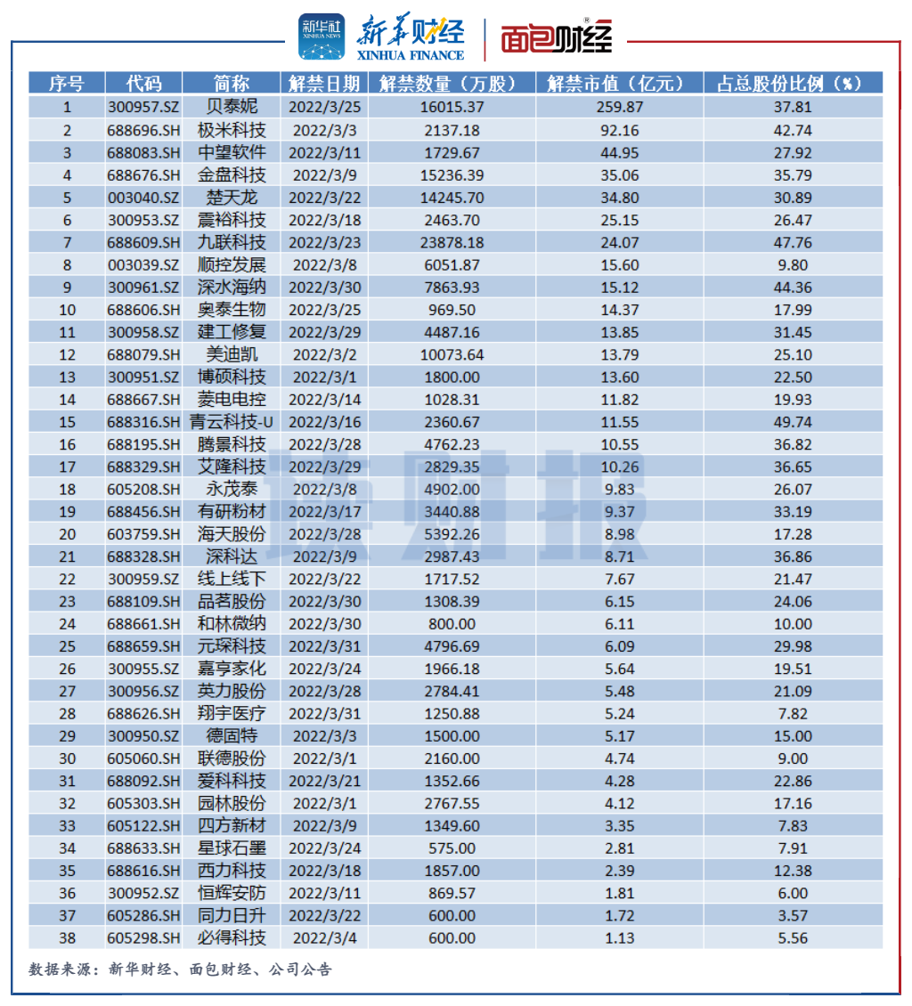解禁比例方面,奧美醫療、深科達及金盤科技為解禁占比前三名,解禁比例均超30%。其中,奧美醫療解禁比例居首,3月11日將有2.38億首發原股東限售股解禁,占總股本比例為37.60%。