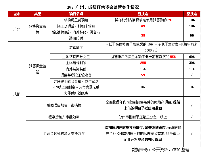 對比廣州、成都此輪新政,共性特征在于都不約而同放松了對預售資金的監管,調低了處于不同工程進度的留存比例:廣州將項目封頂前,封頂后、排柵未拆除前和拆除排柵后的留存比例分別降低至累積核準使用預售款的8%,6%和3%,較之前分別降低了2個,4個和2個百分點;成都如是,在項目主體結構工程完成四分之三以及主體結構封頂兩個節點,監管額度內預售資金留存比例分別降低了5個百分點,項目并聯竣工驗收備案后,監管額度內預售資金支取比例可達到 95%。
