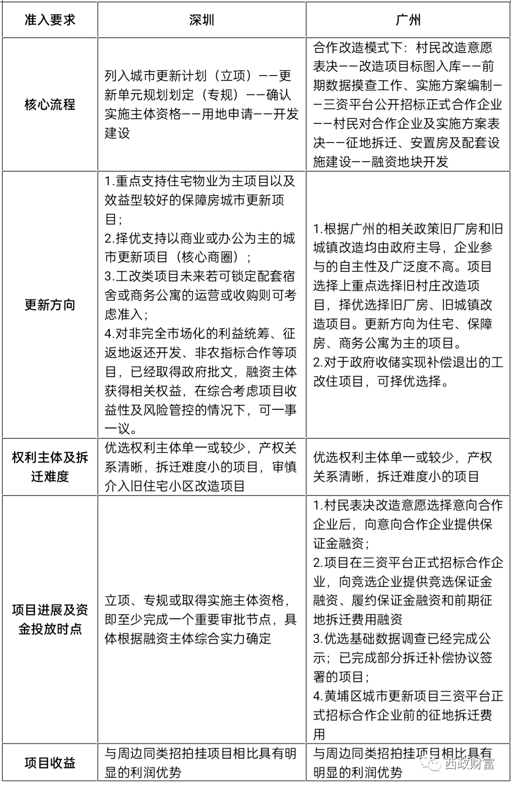 在項(xiàng)目選擇上,綜合考慮項(xiàng)目類型、權(quán)利主體及拆遷難度、項(xiàng)目進(jìn)展以及項(xiàng)目收益情況。以下以深圳和廣州區(qū)域城市更新項(xiàng)目為例進(jìn)行舉例說明: