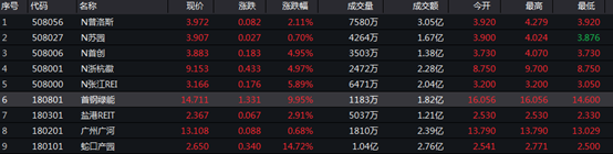 9只首批上市的公募REITs,全部收漲,成交量也較活躍,其中蛇口產(chǎn)園日內(nèi)成交量超1億。具體交易情況如下圖: