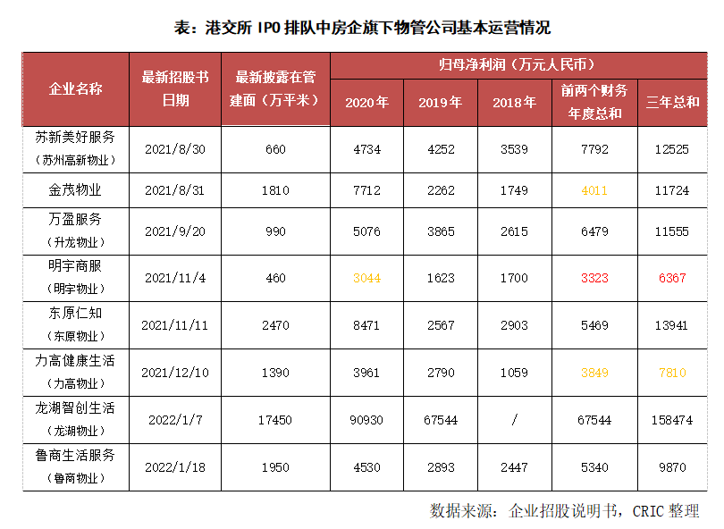 上市門檻的提升導(dǎo)致部分物企在招股書失效后就放棄了繼續(xù)上市的嘗試,比如眾安集團旗下的眾安智慧生活等。2021年新遞交上市申請的28家物管企業(yè)中,有9家在招股書到期后就暫時放棄了繼續(xù)申請上市。而在截至1月27日仍在港交所排隊的房企旗下物管企業(yè)中,明宇商服的盈利指標(biāo)低于港交所門檻,部分企業(yè)匯率換算后檫過門檻。整體來看,當(dāng)前還在排隊等待IPO的房企旗下物管企業(yè)中,大部分都能滿足要求。