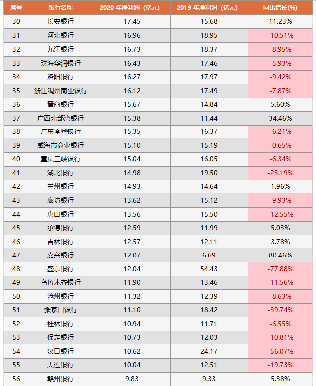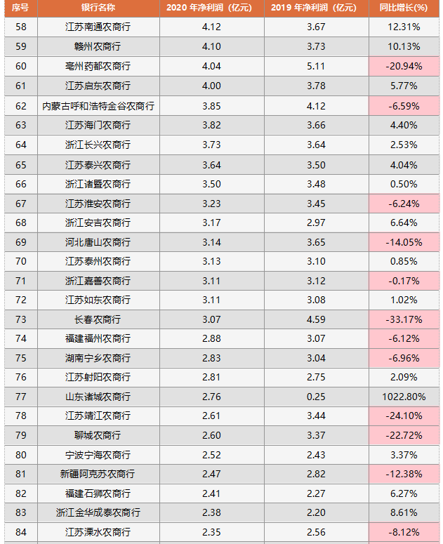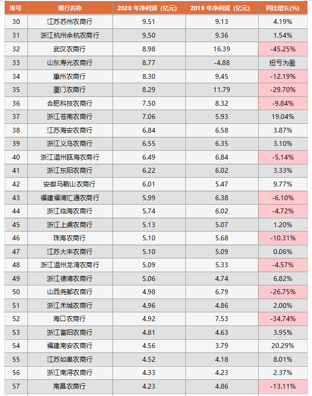 浙江縉云農商行、銅陵農商行、張家界農商行、廣東龍門農商行等38家農商行,凈利潤處于1億元以下,其中有33家呈現同比負增長,僅有4家銀行同比正增長,分別是廣東龍門農商行、貴州清鎮農商行、浙江紹興恒信農商行、山東榮成農商行,吉林蛟河農商行2020年虧損收窄,從2019年的-1.56億元到2020年的-1.14億元。