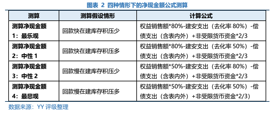 我們的假設(shè)最核心的是假設(shè)企業(yè)不再拿地和到期債務(wù)清償為主(含可動(dòng)用貨幣資金),在此基礎(chǔ)上大致基于以下次生假設(shè):分2個(gè)維度,各區(qū)分2種情形:周轉(zhuǎn)去化率樂觀及悲觀分別為80%、50%;銷售回款率樂觀時(shí)80%,悲觀時(shí)僅為50%,總計(jì)從樂觀到悲觀延伸4種組合。