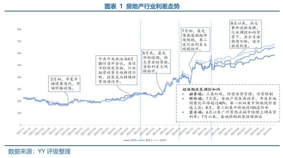 政策調(diào)控背景下,華夏幸福、藍(lán)光以及恒大等主體負(fù)面輿情不斷,7月以來,接連負(fù)面輿情釋放導(dǎo)致行業(yè)局面持續(xù)悲觀,而政策繼續(xù)加碼,負(fù)面情緒釋放進(jìn)一步推高利差走擴(kuò),而隨著花樣頻出,市場的信心仍在進(jìn)一步下墜中。