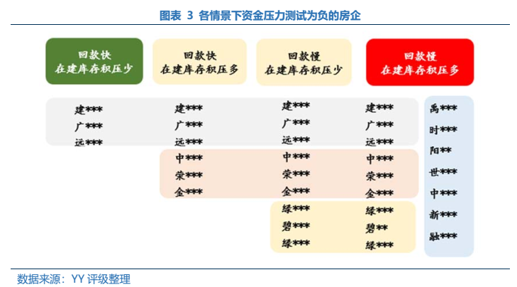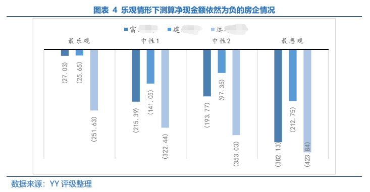 在最樂觀情形下,F(xiàn)L、JY等名字主體,仍是有資金缺口;而在中性1組合下,則RS、JK等接連扛不住,緊接著中性壓力測試2下則是Grennland等也加入陣營,而在去化和回款雙重降幅悲觀預(yù)期下,此前的YZ、ZN等主體紛紛中招。殺傷面之廣,似乎壓力的進(jìn)行仍在進(jìn)行中。