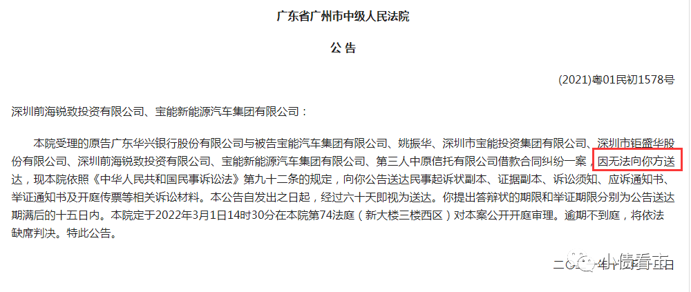 《小債看市》注意到,廣州市中級人民法院2021年12月13日的一份送達(dá)公告中,廣東華興銀行與“寶能系”借款合同糾紛一案,顯示無法送達(dá)。