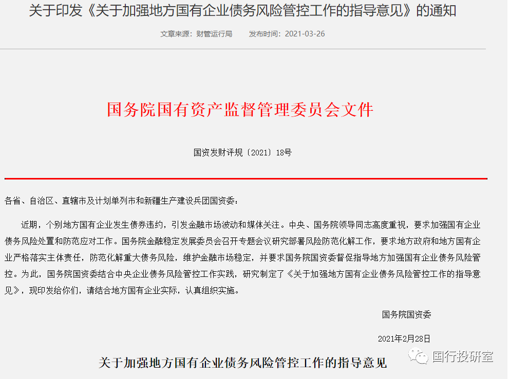 2021年3月26日,國資委官網正式公布《關于加強地方國有企業債務風險管控工作的指導意見》(以下簡稱18號文)。18號文的簽發時間為2021年2月28日,實際上已于近日下發給各地方國資委。
