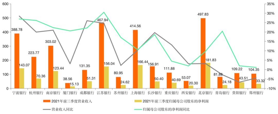 縱觀15家A股上市城商行,2021年前三季度的整體業績表現為正增長,呈現出逐步擺脫疫情影響的良好經營態勢。零壹智庫選取營業收入與歸母公司凈利潤2項指標,綜合觀察城商行之間的業績表現: