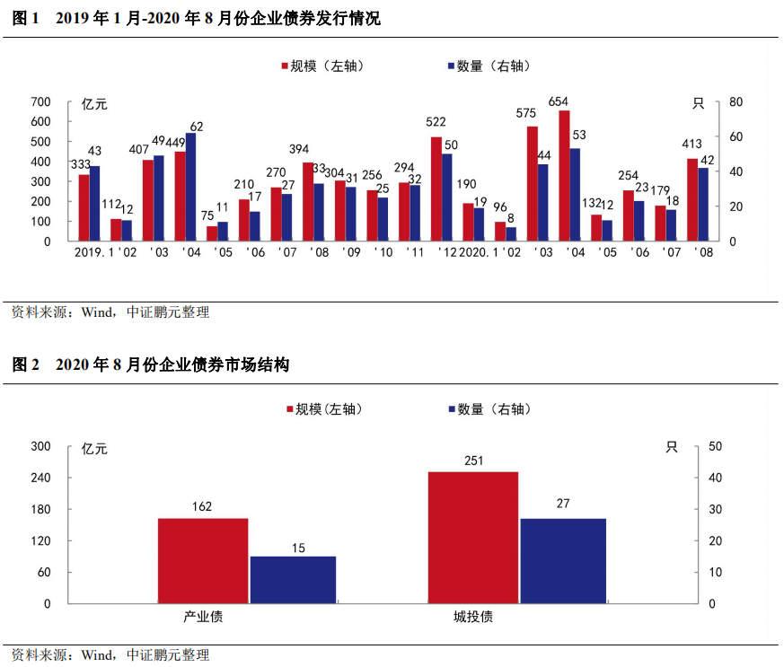 2020年8月,企業(yè)債券發(fā)行42只,發(fā)行規(guī)模413.09億元,與上年同期相比分別增長27%和5%;與2020年7月相比,發(fā)行數(shù)量和發(fā)行規(guī)模分別增長133%和131%。從市場結(jié)構(gòu)來看,8月發(fā)行的企業(yè)債有15只為產(chǎn)業(yè)債,發(fā)行規(guī)模162.30億元。整體看,8月,到期規(guī)模大幅增長,市場環(huán)境相對穩(wěn)定,當月發(fā)行規(guī)模順勢增長。