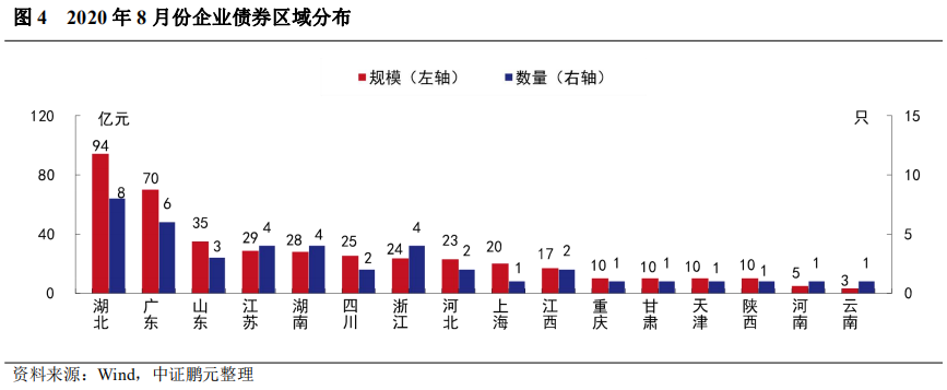 2020年8月,共有16個省份發(fā)行了企業(yè)債券。其中,湖北省企業(yè)債券的發(fā)行規(guī)模最大,為94.29億元;其次是廣東省發(fā)行了70億元,位居第二位;江蘇省和湖南省分別發(fā)行28.70和28億元億元,規(guī)模也較大。從發(fā)行數(shù)量上看,湖北省發(fā)行8只,廣東省發(fā)行6只,江蘇省、湖南省和浙江省分別發(fā)行4只,其他城市發(fā)行數(shù)量在3只及以下。與上年同期相比,8月有11個省份發(fā)行規(guī)模較上年增長,其中,湖北省上年同期未發(fā)行,本期發(fā)行規(guī)模大幅增長,此外,四川省和廣東省分別增長68.7%和55.6%,漲幅較大;5個省份發(fā)行規(guī)模較上年減少,其中,陜西省發(fā)行規(guī)模同比下降66.7%,降幅最大。