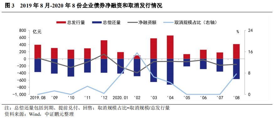 從凈融資情況來看,8月企業(yè)債券總發(fā)行規(guī)模413.09億元,總償還規(guī)模569.03億元,本月表現(xiàn)為凈償還155.94億元,連續(xù)8個月表現(xiàn)為凈償還。此外,2020年8月有4只企業(yè)債券取消發(fā)行,原計劃發(fā)行規(guī)模合計31.70億元。2020年1-8月份,企業(yè)債凈融資-1,219.99億元,較上年同期凈償還量增加213.76億元,累計取消發(fā)行企業(yè)債15只,原計劃發(fā)行規(guī)模127.80億元。