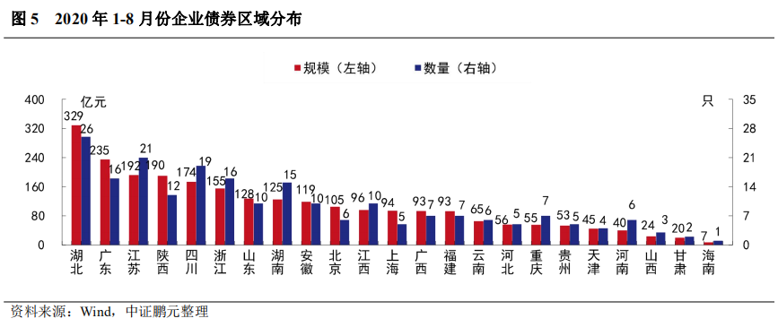 綜合2020年1-8月份情況來看,湖北省以328.79億元的發(fā)行規(guī)模位居首位;廣東省以235億元的發(fā)行規(guī)模位居第二;江蘇省和陜西省分別發(fā)行192億元和 190億元,四川省和浙江省分別發(fā)行173.50億元和155.10億元,其余省份發(fā)行規(guī)模在150億元以下。從發(fā)行數(shù)量上看,湖北省發(fā)行26只,位居首位;江蘇省發(fā)行21只,位居第二位;四川省發(fā)行19只,廣東省和浙江省各發(fā)行16只,其他省份發(fā)行數(shù)量在15只及以下。與上年同期相比,12個省份發(fā)行規(guī)模出現(xiàn)增長,其中,上海的企業(yè)債發(fā)行規(guī)模累計同比增長242%,陜西省發(fā)行規(guī)模同比增長174%,湖北省和福建省漲幅也在130%以上;10個省份發(fā)行規(guī)模出現(xiàn)下降,山西省和貴州省下降幅度在60%以上,降幅較大;此外,東北三省和新疆、西藏尚未發(fā)行。