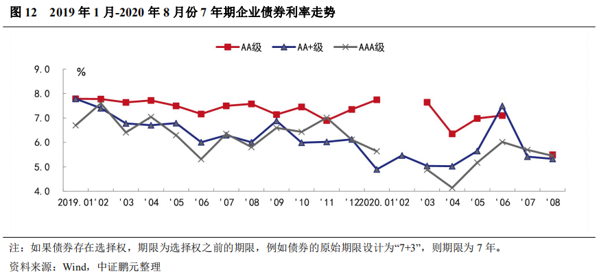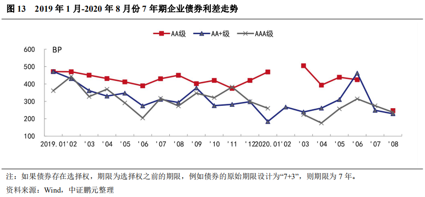 與上月相比,2020年8月,7年期企業(yè)債各級別的平均發(fā)行利率均下行,其中,AAA級下行25BP, AA級下行9BP;利差方面,AAA級和AA+級分別收窄37BP和20BP。
