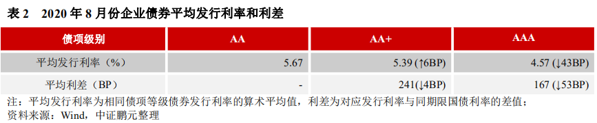 2020年8月,債券市場流動性經(jīng)歷過極度寬松和緊張后回歸平穩(wěn),同時受償還壓力影響,當月債券發(fā)行數(shù)量提升,高信用等級的發(fā)行主體增信比例提升,債券平均發(fā)行利率下行,平均發(fā)行利差收窄。