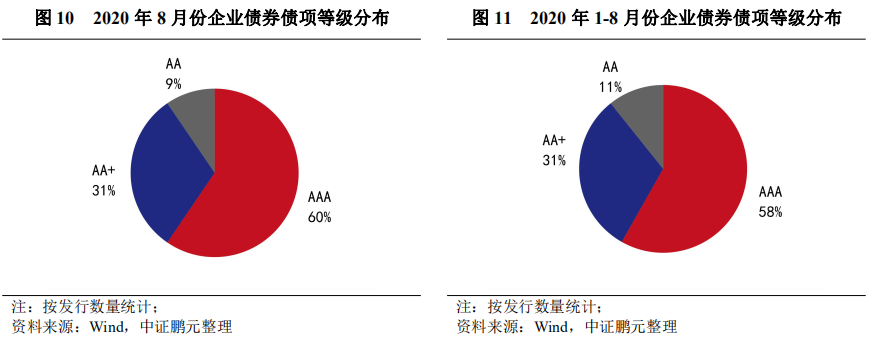 2020年8月發(fā)行的企業(yè)債債項信用等級在AA+級及以上。具體來看,AAA級發(fā)行25只,占比60%,較上月下降12個百分點;AA+級發(fā)行了13只,占比31%,較上月上升3個百分點;AA級發(fā)行4只,占比9%,上月未發(fā)行。總體而言,8月發(fā)行AA+及以上的高級別品種數(shù)量占比91%,較上月下降9個百分點。綜合2020年1-8月情況來看,AAA級占比58%,同比上升17個百分點;AA+級占比31%,同比上升1.1個百分點;AA級占比11%,同比下降18.2個百分點。