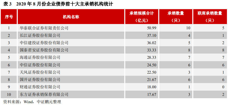就承銷機構(gòu)而言,2020年8月共有28家機構(gòu)參與企業(yè)債券的承銷工作。華泰聯(lián)合承銷50.99億元,位居第一;長江證券以承銷37.10億元位居第二,中信建投承銷36.02億元,位居第三。前五大承銷商,承銷規(guī)模合計占比45%。