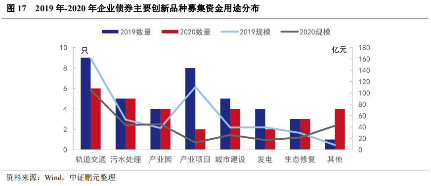 從募集資金用途看,綠色企業(yè)債主要用于軌道交通項目,其次是污水處理、城市建設(shè)和產(chǎn)業(yè)園區(qū)等,其中城市建設(shè)包括海綿城市、智慧城市等。與2019年相比,本年用于產(chǎn)業(yè)升級項目的綠色債較少,用于污水處理、綠色產(chǎn)業(yè)園、城市建設(shè)和生態(tài)修復(fù)的綠色企業(yè)債數(shù)量較多。隨著縣城新型城鎮(zhèn)化建設(shè)的推進,智能化、綠色化要求提升,未來綠色企業(yè)債的發(fā)展存在發(fā)展空間。