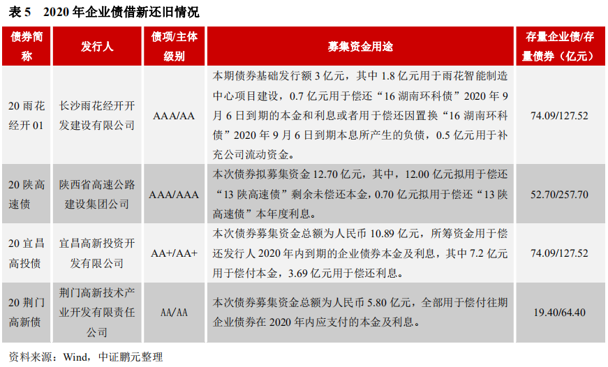 8月有3只企業(yè)債的募集資金用途涉及借新還舊,分別是“20雨花經(jīng)開01”、“20宜昌高投債”和“20荊門高新債”,截至8月末共有4只企業(yè)債用于償還存量債券。2020年初,受新冠肺炎疫情影響,發(fā)改委曾在2月指出,“對于自身資產(chǎn)質(zhì)量優(yōu)良、募投項目運營良好,但受疫情影響嚴重的企業(yè),允許申請發(fā)行新的企業(yè)債券專項用于償還2020年內(nèi)即將到期的企業(yè)債券本金及利息。”