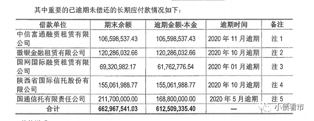 財(cái)報(bào)顯示,九華建投逾期非標(biāo)融資債權(quán)機(jī)構(gòu)分別為中信富通融資租賃本金1.06億元;微銀金融租賃1.2億元;國網(wǎng)國際融資租賃本金6176萬元;陜西省國際信托本金1.55億元以及國通信托本金為1.69億元。