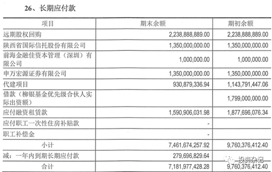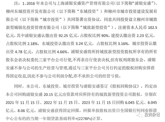 在后續的負債部分,可以看到公司在長期應付款里面有一筆22.38億的遠期股權回購款,根據審計報告的披露,該筆遠期回購款正是公司出資持有的柳州市城致新型城鎮化投資管理有限公司找浦銀安盛融資給公司放的款。