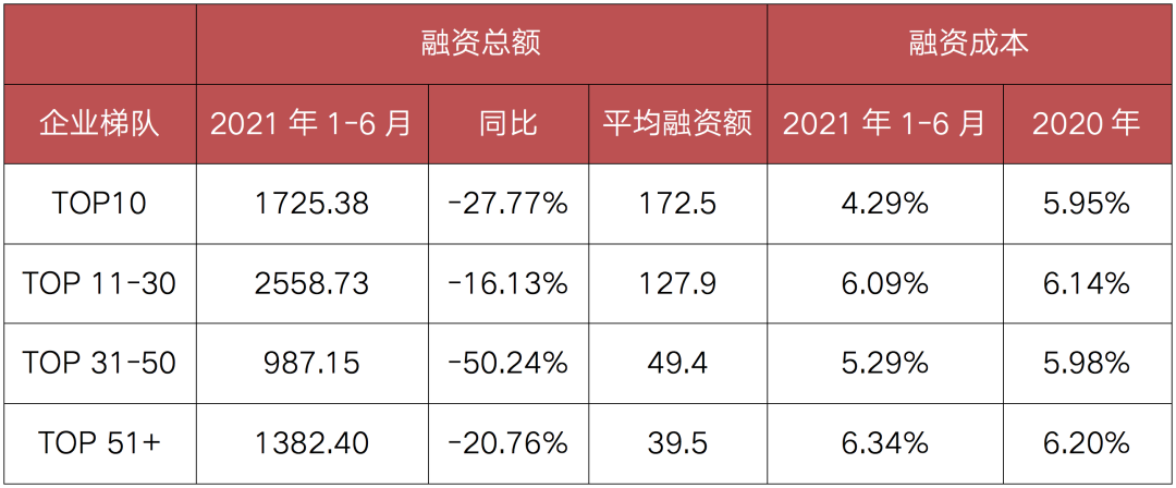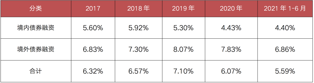 截至2021年6月,100家典型房企新增債券類融資成本為5.59%,較2020年下降0.48個百分點,其中境外債券融資成本達6.86%,下降0.97個百分點,境內債券融資成本4.40%,較2020年下降0.03個百分點。