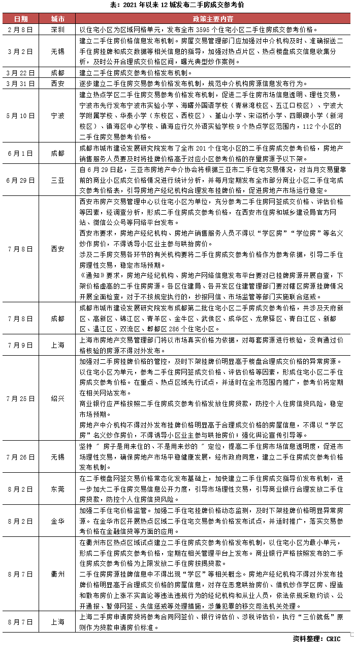 據(jù)不完全統(tǒng)計(jì)顯示,自2月8日深圳率先發(fā)布二手住房成交參考價(jià)格以來(lái),截至目前已有無(wú)錫、成都、西安等12個(gè)城市相繼建立二手房成交參考價(jià)格,以期維穩(wěn)二手房市場(chǎng),防止二手房?jī)r(jià)格異動(dòng)上漲。
