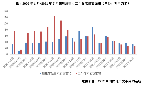 2021年2月,深圳率先落地二手房成交參考價(jià),疊加監(jiān)管部門(mén)嚴(yán)打經(jīng)營(yíng)貸,嚴(yán)防信貸資金違規(guī)流入房地產(chǎn)市場(chǎng)。受此影響,2021年二季度以來(lái),深圳二手房市場(chǎng)下行壓力加劇,成交逐月走低,6、7兩月二手住宅成交面積低至26萬(wàn)平方米,再創(chuàng)年內(nèi)新低。