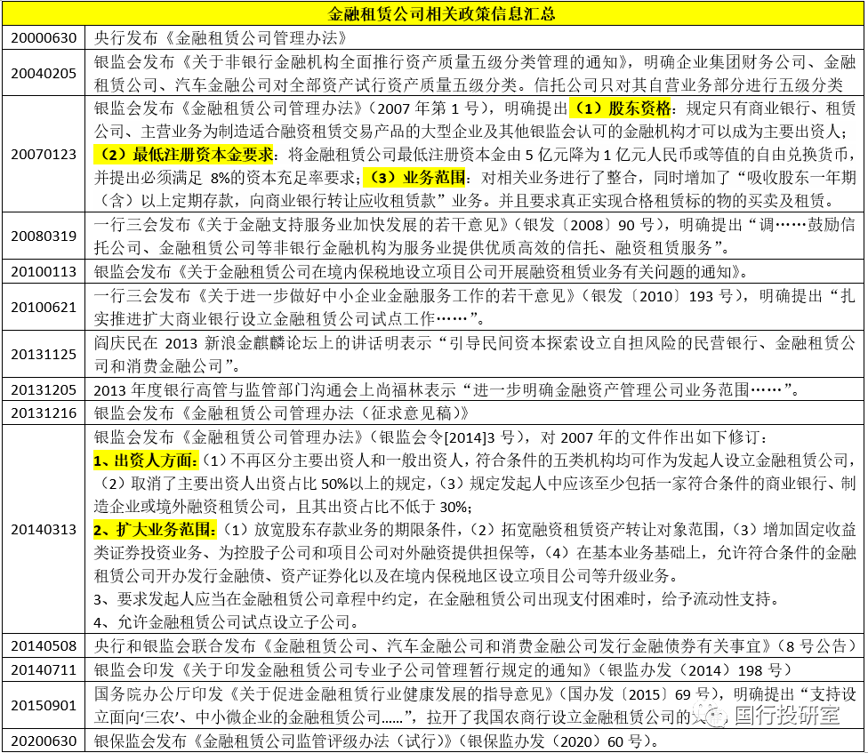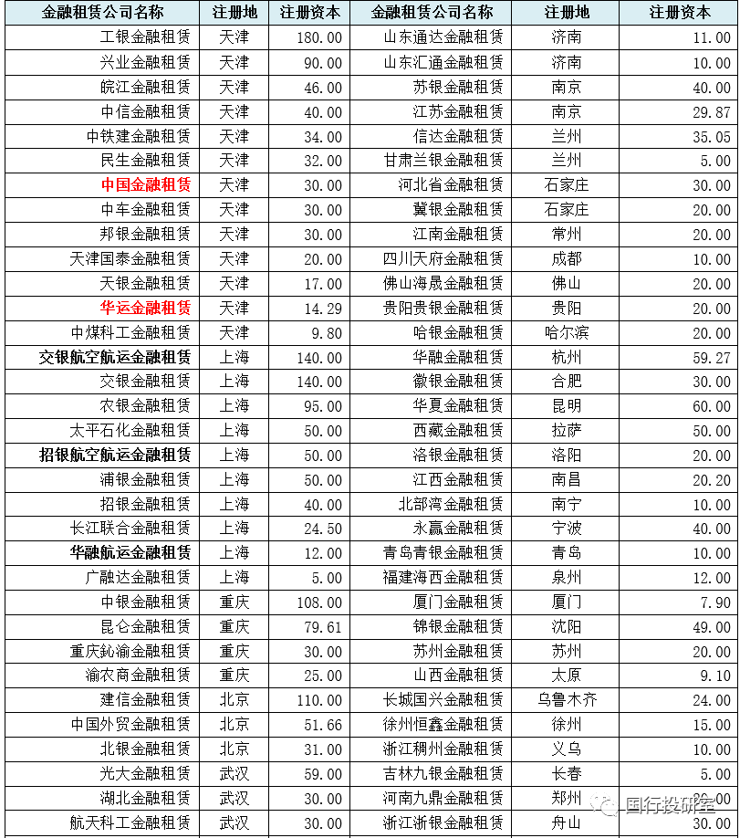 1、目前有3家上市金融租賃公司,分別為中國(guó)金融租賃(2312.HK)、國(guó)銀金融租賃(1606.HK)和江蘇金融租賃(600901.SH)。