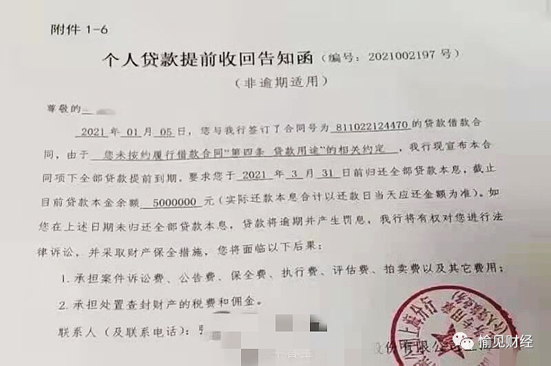 喏,不是已經(jīng)有某股份制銀行上海分行對“貸款用途”有問題的個貸在發(fā)提前收回函了么。這貸款人估計也是頭大了,500萬要在月底前籌出來,否則還要產(chǎn)生罰息。