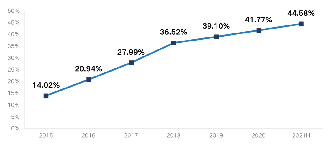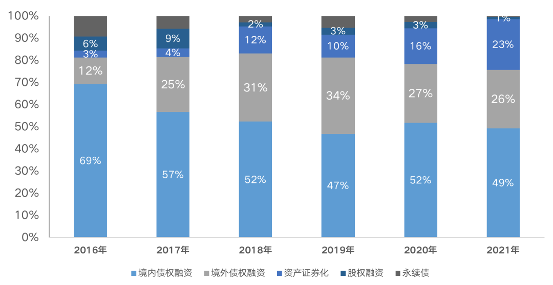圖:2016-2021年100家重點(diǎn)房企融資方式比例