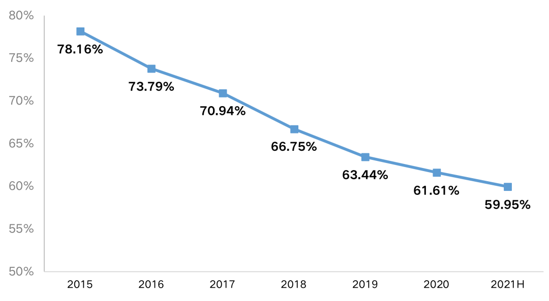 樣本房企歸母權(quán)益/總權(quán)益占比從2015年的78.16%減少至2021年中期的59.95%。少數(shù)股東權(quán)益增長過快,主要是近年來房企加大了項(xiàng)目的合作比例。