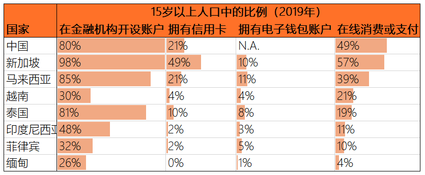 根據(jù)2019年中金公司研究部數(shù)據(jù),在傳統(tǒng)金融業(yè)務(wù)方面,新加坡、馬來西亞和泰國15歲以上人口在金融機(jī)構(gòu)開設(shè)賬戶比例超過80%,印尼、越南、緬甸均不足50%,具有較大的提升空間。除新加坡以外,東南亞其他主要國家15歲以上人群擁有信用卡的比例均不到25%,其中越南、印尼、菲律賓、緬甸甚至不足5%;另一方面在數(shù)字金融業(yè)務(wù)方面,使用在線消費(fèi)或支付的15歲以上人口在總?cè)丝诒壤行录悠聝?yōu)勢明顯占比為57%,馬來西亞和越南為39%和21%,泰國、印尼和菲律賓在10%-20%之間,緬甸則為4%,在線金融業(yè)務(wù)發(fā)展緩慢,相比49%的15歲以上中國人進(jìn)行在線消費(fèi)或支付,均有較大的發(fā)展空間。
