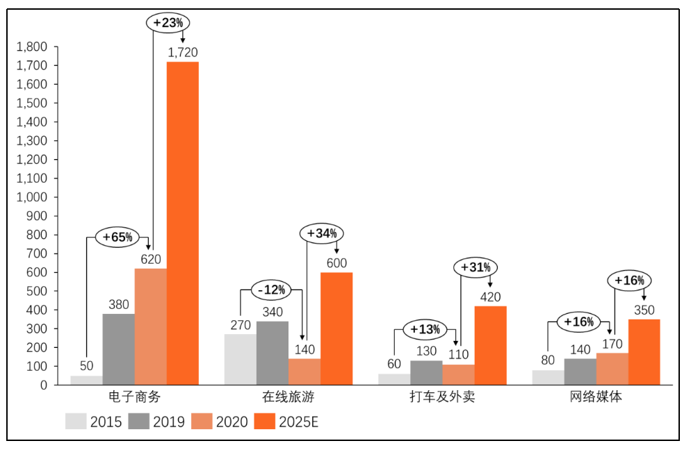 分行業(yè)看,2020年東南亞電子商務(wù)、在線旅游、打車及外賣服務(wù)、網(wǎng)絡(luò)媒體GMV則分別為620億美元、140億美元、110億美元、170億美元,2015年-2020年年均復(fù)合增長率分別為65%、-12%、13%、16%。其中電商占東南亞互聯(lián)網(wǎng)經(jīng)濟(jì)整體規(guī)模59.6%,其他三類則占比在15%左右,主要是由于2020年受新冠疫情影響,在線旅游和交通出行行業(yè)出現(xiàn)了萎縮,電商和網(wǎng)絡(luò)媒體的快速增長一定程度抵消了其負(fù)面影響。預(yù)計(jì)2025年電子商務(wù)、在線旅游、打車及外賣服務(wù)、網(wǎng)絡(luò)媒體GMV將分別達(dá)到1720億美元、600億美元、420億美元和350億美元,預(yù)計(jì)2020年-2025年年均復(fù)合增長率將達(dá)到23%、34%、31%、16%。