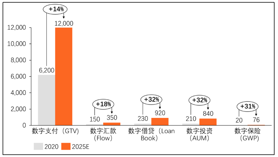 其中數(shù)字支付服務(wù)發(fā)展規(guī)模最大,目前數(shù)字支付總交易額(GTV)已達(dá)6200億美元,預(yù)計(jì)2025年總交易額(GTV)將達(dá)到12000億美元,主要來源于電商、打車等線上交易服務(wù)帶來的支付驅(qū)動(dòng)。此外盡管其他金融服務(wù)仍然處于初級(jí)數(shù)字化階段,但是據(jù)預(yù)測2020至2025年未來五年內(nèi),數(shù)字匯款、借貸、投資和保險(xiǎn)的滲透率將會(huì)有兩到三倍的增長,依次達(dá)到28%、8%、11%、9%。預(yù)計(jì)2020年-2025年均復(fù)合增長率將依次達(dá)到18%、32%、32%、31%。