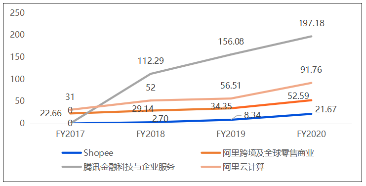 注:1.Shopee為騰訊投資東南亞電商公司;2.阿里跨境零售營收包括自營東南亞電商Lazada、速賣通、土耳其電商Trendyol;3.騰訊云計(jì)算業(yè)務(wù)營收目前屬于金融科技與企業(yè)服務(wù)類目