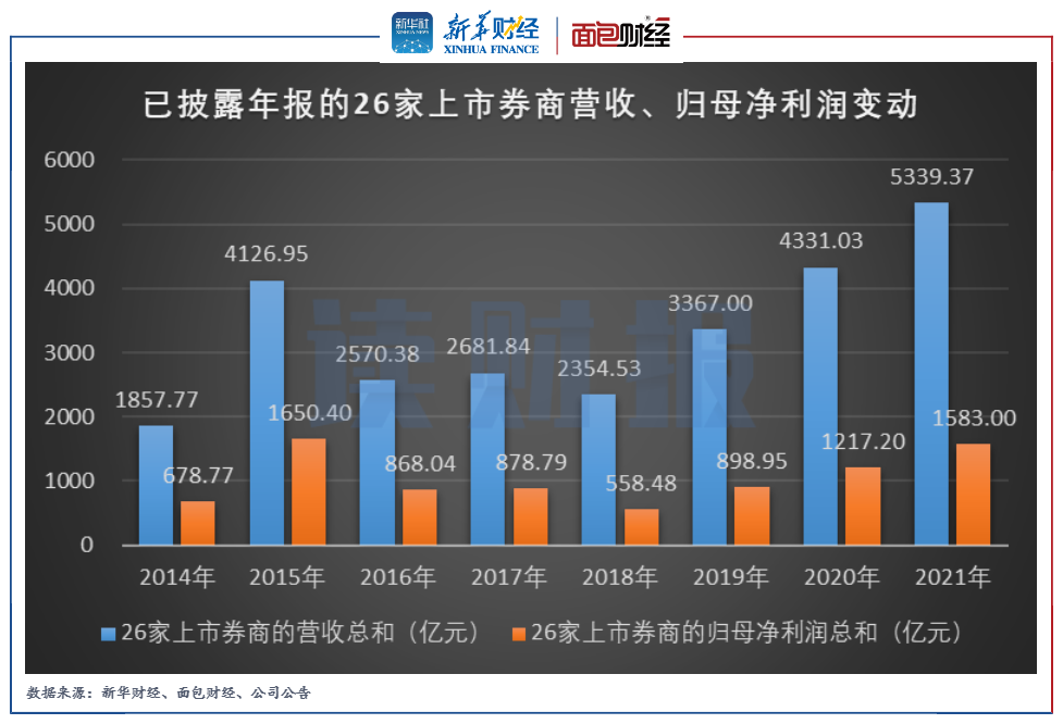 截至3月30日,中信證券、國泰君安、華泰證券等26家上市券商發(fā)布2021年年報,合計實現(xiàn)營收和歸母凈利潤分別為5339.37億元和1583億元,同比分別增加約23%和30%。