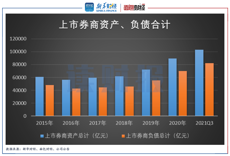 數(shù)據(jù)統(tǒng)計顯示,2016年至2021年三季度,合計40余家上市券商的總資產(chǎn)和總負(fù)債呈現(xiàn)出上升趨勢,整體而言,券商規(guī)模持續(xù)擴(kuò)張。