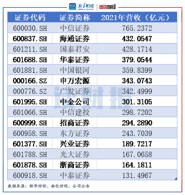 在已披露2021年年報的上市券商中,華林證券當(dāng)年的營收同比下滑,其余券商的營收均有所增長。其中,中信證券、海通證券、國泰君安等8家大型券商的營收超過300億元。